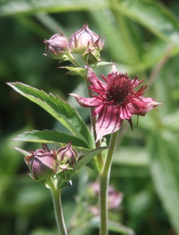 Das Sumpfblutauge (Potentilla palustris) ist ein Verlandungspionier. Seine Wurzelsprossen, auch Rhizom genannt, findet man in Feuchtwiesen, Flachmooren und im Uferbereich von kalk- und nährstoffarmen Stillgewässern. Aus diesem Rhizom entspringen seitlich die handförmig geteilten und grob gesägten Blätter. Ihr Stiel ist dicht kurz behaart. Der mehrblütige Blütenstand entspringt rhizomnah in den Blattachseln und wird etwa 20 bis 30 cm hoch. Die dunkelroten Blüten besitzen etwa 2 cm lange dreieckige ebenfalls dunkelrote, spitz auslaufende Kelchblätter Sie überragen die gleichfarbigen Blütenkronblätter deutlich. Pollenträger sind in jeder Blüte zahlreich vorhanden. Der oberständige Fruchtknoten ist bei der Reife leicht fleischig aufgewölbt, kurz behaart und trägt wie bei der Erdbeere zahlreiche kleine Nüsschen außen auf der Fruchtschale. Die Samen werden durch den Wind oder mit der Wasserströmung leicht fortgetragen. Die Blüte beginnt im Juli und reicht bis zum Endes des Sommers.